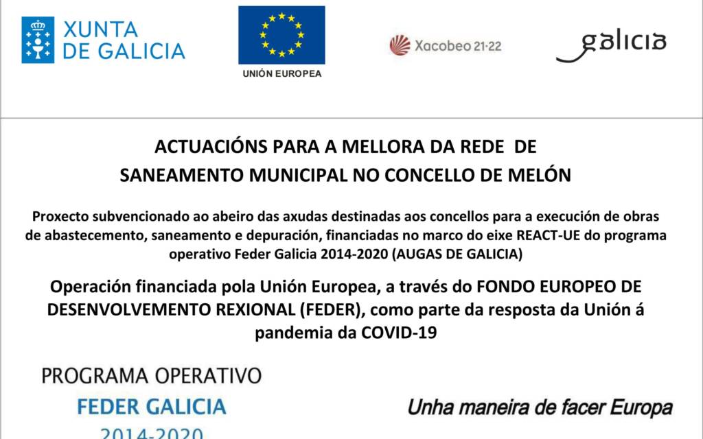 fosas sépticas etc. Las obras consisten en instalar/renovar tuberías, arquetas para limpieza de fosas, instalación de nuevos colectores. Este proyecto contará con el apoyo financiero de la Unión Europea, a través del FONDO EUROPEO DE DESARROLLO REGIONAL (FEDER), como parte de la respuesta de la Unión a la pandemia de la COVID-19. (EJE REACT-UE DEL PROGRAMA OPERATIVO FEDER GALICIA 2014-2020).