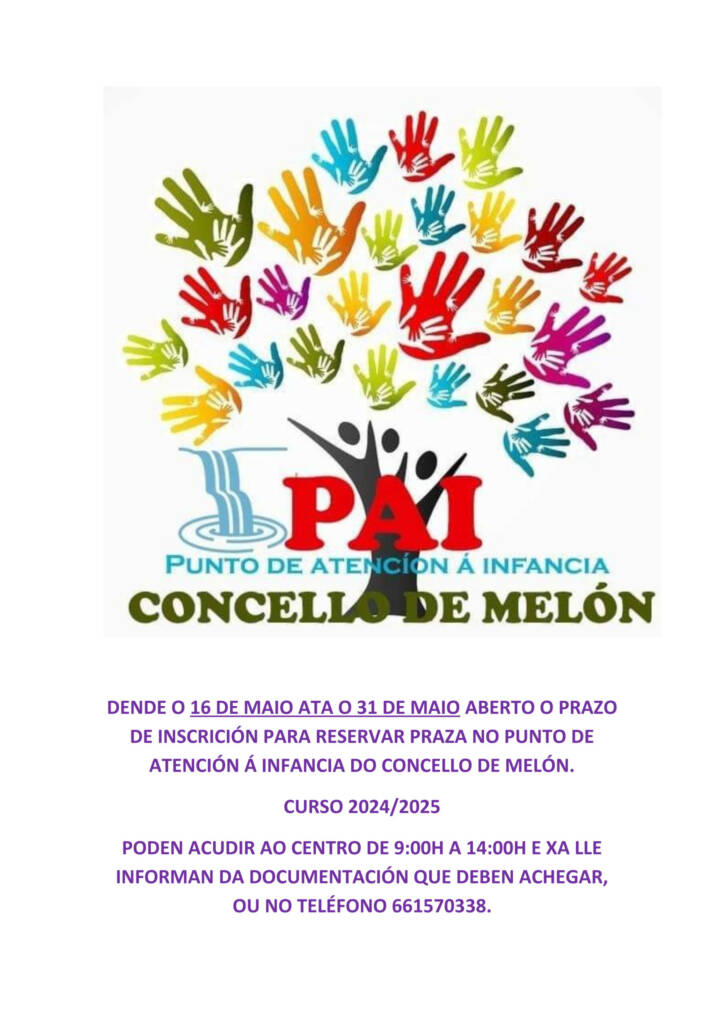 DENDE O 16 DE MAIO ATA O 31 DE MAIO ABERTO O PRAZO DE INSCRICIÓN PARA RESERVAR PRAZA NO PUNTO DE ATENCIÓN Á INFANCIA DO CONCELLO DE MELÓN.